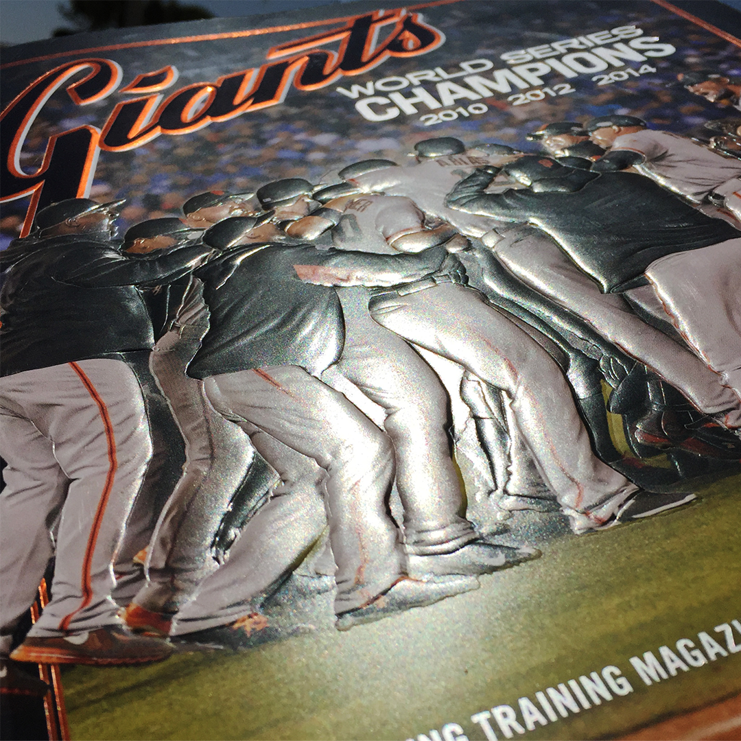 The 2015 Program celebrated three World Series Championship titles for the Giants in 2010, 2012, 2014. To commemorate this achievement, and along with the assistance of the San Francisco Giants, The Scottsdale Charros, and Metal Magic, we designed and created a multilevel embossing die and three foil-stamping dies for the cover.
