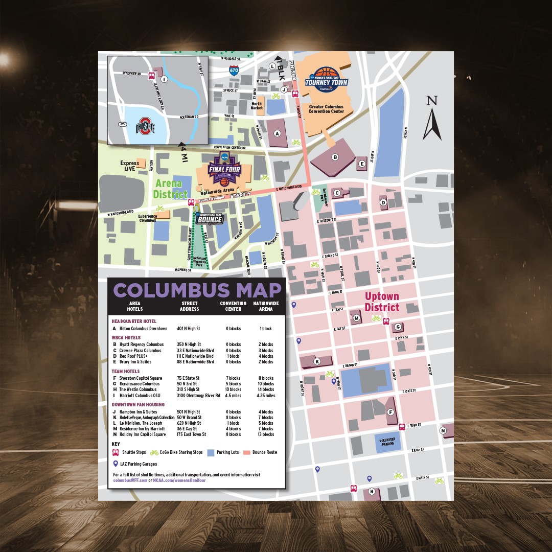 The NCAA Women’s Final Four was held in Columbus, Ohio in 2018. I was tapped by the Columbus Sports Commission to design graphics for events that week, using brand standards provided by the NCAA. I designed dozens digital and print materials, including Columbus Tourism Map, Videoboard Templates, Snapchat Filters, Program, Podium Wraps, Signage, Banners, Feather Flags, Ads, Credential Lanyards, Reports, Covers, Posters, Flyers, Operations Binder, and more.