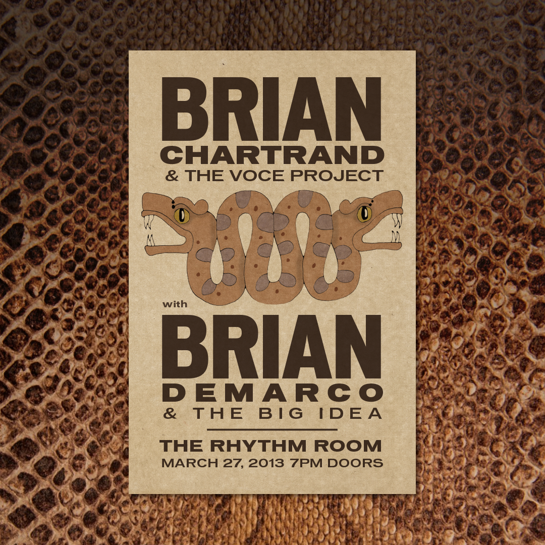 This poster was designed for a live concert featuring Brian Chartrand and Brian DeMarco, two Phoenix-based singer songwriters. The goal with this project was to tie together the two Brians and catch someone’s eye for just a moment to remember the date. The first slide is the thumbnail sketch I knocked out to see if the clients like the concept. The second slide is an outline drawing of the serpent I drew to scan and digitize. And the last slide is the finished poster, digitally colorized and typeset.